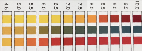 - Läs av pH-värdet med hjälp av färgkartan! Om pH-värdet är mellan 4,5 och 6,5 är lösningen sur! Om pH-värdet är mellan 7,5 och 10 är lösningen basisk.