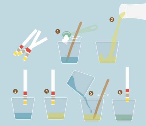 - Blanda nu ihop de bikarbonatvattnet med vinägern, använd träspateln för att blanda ordentligt! Smaka på blandningen - hur har smaken förändrats? Doppa din tredje pH-sticka i lösningnen - och läs av hur har pH-värdet, har det förändrats?