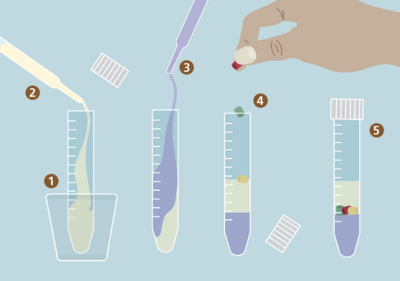 Vad händer med plastpärlorna? Hur kommer det sig att vätskorna inte blandas utan lägger sig i skikt? Och varför lägger de sig i den här ordningen? Skaka ditt provrör och observera vad som händer - blandar sig vätskorna? Ändras ordningen?